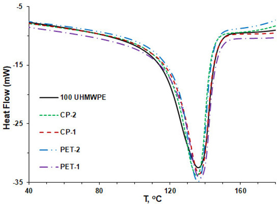 The effect of the introduction of PET or CP coke grains on the crystallization and melting behavior of UHMWPE in composites was studied using non-isothermal DSC measurements. Figure 7 and Figure 8 show the results of DSC studies, namely the peaks corresponding to the crystallization (Figure 7) and melting (Figure 8) for the composites with 10 vol.% coke fillers.
