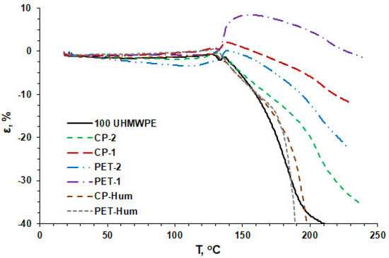 The curves for CP-Hum and PET-Hum composites are similar to each other and are characterized by a rapid increase in deformation with temperature, which is similar to pure UHMWPE. Presumably, this is the result of poorer adhesion and, consequently, a weak reinforcing effect of oxidized PET and CP coke particles.