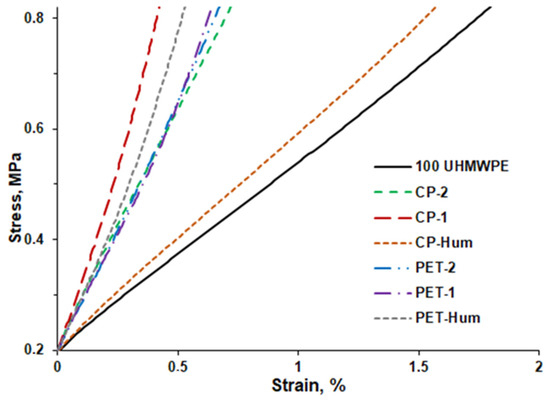 For the studied composites, the stress/strain dependences were investigated in the stress range of 0–0.6 MPa using the compression mode, which is shown in Figure 11. These curves are similar to those obtained in previous studies for UHMWPE with different carbon fillers [67,68]. As can be seen from the figure, in this stress interval, these dependencies are almost linear and were used to determine the values of Young’s modulus from the slope of the straight lines.