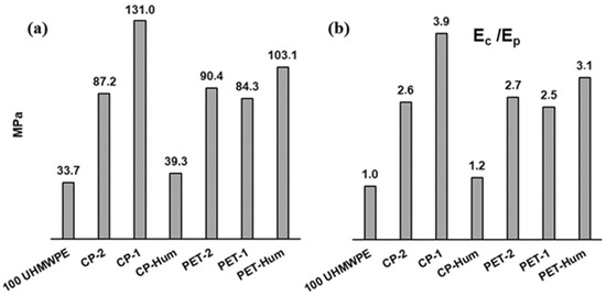 The calculated values of the Young’s modulus for the composites are shown in Figure 12a. As can be seen, the lowest value of Young’s modulus is observed for pure UHMWPE (E = 33.7 MPa), while the highest value is for the composite CP-1 (E = 131.0 MPa). Very different values of the Young’s modulus of pure UHMWPE and its composites can be found in the literature, which may depend on sample processing and test methods (tensile or pressure) [69,70,71,72], as well as for other composite materials with different polymer matrices [24].