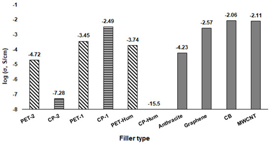 Figure 13 shows electrical conductivity values for composites containing the coke-based PET and CP fillers and the conventional carbon microfiller (anthracite) and nanofillers (graphene, MWCNT, CB). The concentration of fillers in all cases was 10 vol.%. The highest value of electrical conductivity among the composites with coke fillers was achieved for the CP-1 composite with the small coke particle size. The value of electrical conductivity for this composite is close to the value of conductivity of composites with graphene, MWCNT, and CB and is two decimal orders higher than that of composites with anthracite.