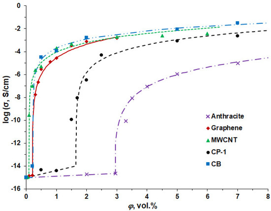 In the last few years, interest in carbon micro- and nanofillers like carbon black, carbon nanofibers, and nanotubes [3,12], fullerenes [24], CQD [13], graphenic structures [3,14], or thermally expanded graphite [25], rapidly increased. These fillers improve the mechanical properties of carbon–polymer nanocomposites and, importantly, they may cause polymer composites to become electrically or thermally conductive [3,24]. The great interest in conductive carbon micro- and nanofillers is, among others, due to the fact that when the content of their particles in the polymer matrix is above the critical concentration (φc—percolation threshold), the resulting composite becomes electrically conductive since a conductive network of filler particles is formed in the volume of the polymer [26]. Thus, the transition from an insulator, a polymer matrix, to a conductor, a formed polymer-based composite filled with carbon particles, is realized.