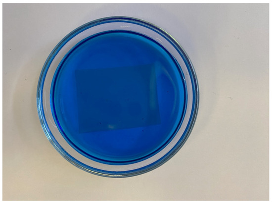 For the investigation of the peculiarities of the crystals which were grown on the Nafion substrate from the supersaturated aqueous solutions of these salts, the techniques of X-ray diffractometry (XRD) and refractometry were used. In these experiments, a Nafion N117 plate with an area of 3 × 2.5 cm2 was placed in a Petri dish filled with an aqueous solution of the tested salt with a volume of 25 mL and a concentration close to the saturation threshold at 20 °C. The solutions were prepared based on either natural deionized water or DDW. In the reference experiments, the same solutions were poured into the Petri dish in the absence of a Nafion plate. Uncovered Petri dishes were placed in a styrofoam box where water was evaporated at constant temperature, and the salt solution became oversaturated. A picture of the CuSO4 crystal growth on the Nafion plate is shown in Figure 1.