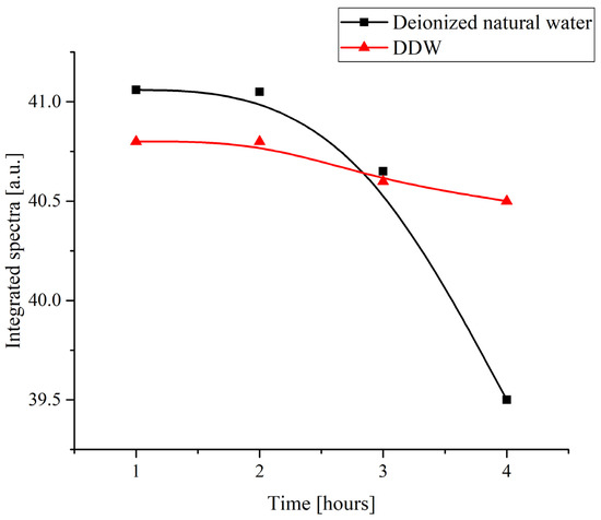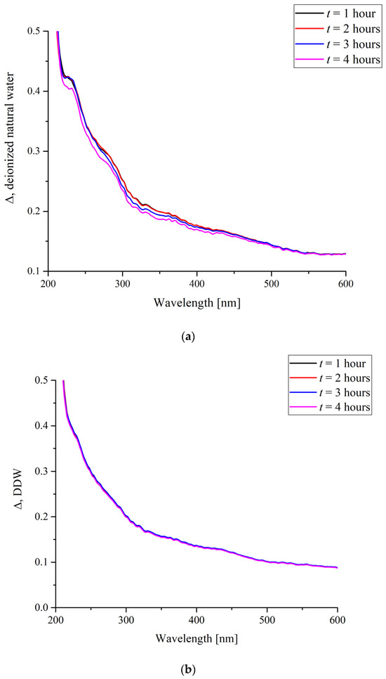 It was found that when a Nafion specimen was immersed in a DDW sample, its absorption remained nearly unchanged with time (Figure 2b), whereas contact with natural deionized water caused a gradual change in the spectrum (Figure 2a). The absorbance decreases with time within the wavelength range of 200 to 500 nm. Any change in the absorption reflects changes in the electronic structure of the specimen, which, at the same time, causes changes in the nuclear configuration. Thus, the decrease in absorbance in a relatively broad spectral range can be predetermined by the changes in the general conformation of chains when the neighborhoods of the groups of different chemical nature and, hence, their own structural parameters are changed. However, the absolute decrease in the absorbance is nearly the same within a subrange of 200 to 400 nm, which may mean that the absorption in this range is predetermined by the spectral response of the groups of the same kind with different internal configurations. Therefore, it is reasonable to consider an integral absorbance.