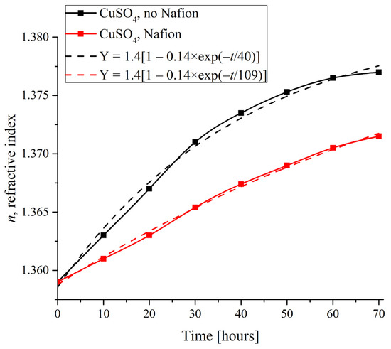 As shown in Figure 8, in the absence of a Nafion plate in a Petri dish, the characteristic time was estimated as τ = 40 h, while in the presence of a Nafion plate it increased to τ = 109 h, i.e., the refractive index on the surface of the solution more quickly reaches its equilibrium value n = 1.4 in the absence of the Nafion plate. Assuming that the evaporation of water from the surface of the solution occurs at the same rate under identical physical conditions, we can claim that the time τ indicates how rapidly the concentration of copper sulfate increases within the probe superficial region for compensating the depletion caused by the deposition. Since such a compensation is much faster in the absence of a Nafion plate in the Petri dish, the ratio of characteristic times in the presence to those in the absence of a Nafion plate can be taken as a rough estimate of the acceleration of the deposition process on the Nafion substrate, which is explained within the framework of the theoretical model, see Section 4.2. Besides that, in accordance with our observations, all studied crystals grew approximately twice as faster on the surface of Nafion compared to the case of absence of a Nafion plate in the Petri dish.