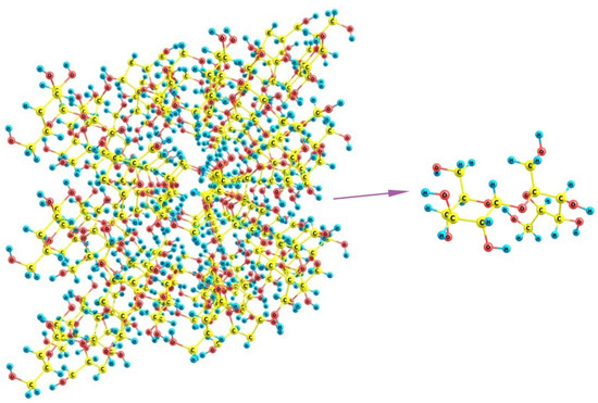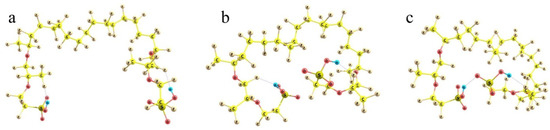 When the SO3H-ended chains are initially kept at the largest possible distance from each other (taking into account that the structure should be extended in both directions, and any group has neighbors from both sides, the mean angles between the direction of the hydrophobic backbone and its polyether side chain should not exceed 90°) and extended to the utmost degree, the energy of the system is the highest (Figure 9a). When the branches are initially intorted, they tend to approach each other to minimize the net dipole moment (Figure 9b); and the electronic energy difference between these two structures is ca. 15 kcal/mol. Finally, if the terminal groups can form an H-bond, the stabilization of the system is maximum. The structure shown in Figure 9c is lower than the previous one by another 10 kcal/mol, which makes it already definitely favorable compared to the one with extended terminal branches (with an energy difference of ca. −25 kcal/mol). When thermal increments to the energy determined also by the different folding of the backbone (which becomes progressively less extended as the SO3H-ended chains become involved in the interaction with each other) are taken into account, the energy differences between the structures are decreased, but remain quite substantial: the ΔGvib relative Gibbs energies are 0 vs. −11 vs. −19 kcal/mol for the (a), (b), and (c) structures, respectively.