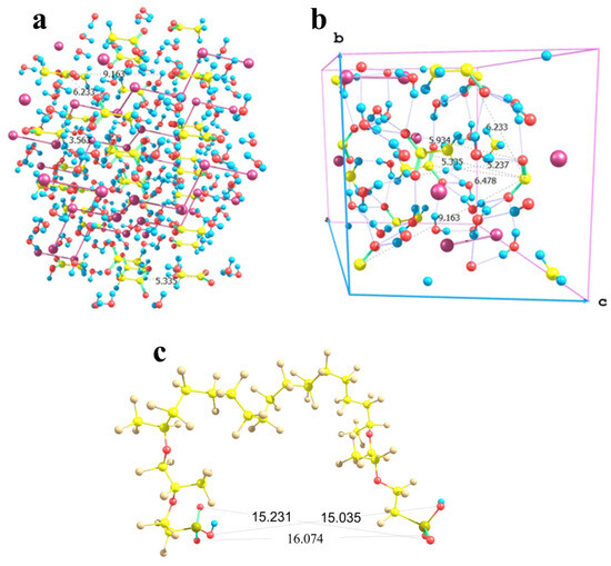 Now, let us turn to the most interesting example of copper sulfate salt. As was mentioned above, it can crystallize to form two different hydrates, namely trihydrate with a monoclinic lattice and pentahydrate with a triclinic lattice. Fragments of both crystal structures are shown in Figure 14a,b respectively. In trihydrate, the first shell of any copper atom involves three water molecules and three sulfate groups, so that the Cu…O distances are not equal (falling in ranges of 1.96 to 1.98 Å in the case of water oxygens and 1.96 to 2.45 Å in the case of sulfate oxygens), but the directions of bonds are quite regular in view of the replicated cells. In pentahydrate, the situation is quite similar, namely, the first shell of copper involves four water molecules and two sulfate groups, and the sulfates are arranged along a nearly C4 local symmetry axis (if only oxygens rather than whole water molecules are taken into account). As a result, here the local O-symmetry of a copper site corresponds to an elongated octahedron: two Cu…O distances to sulfates are equal to 2.41 Å, and Cu…O distances to water oxygens are equal in opposing pairs with a slight difference between the pairs (1.97 and 1.94 Å). The higher local symmetry of pentahydrate imposes stronger restrictions on the possible boundaries that may be imposed by Nafion chains, whereas the generally less symmetric trihydrate structure with the variations in the sulfate group orientations makes the problem of fitting of a crystal structure fragment to the space between Nafion chains more easily solvable.