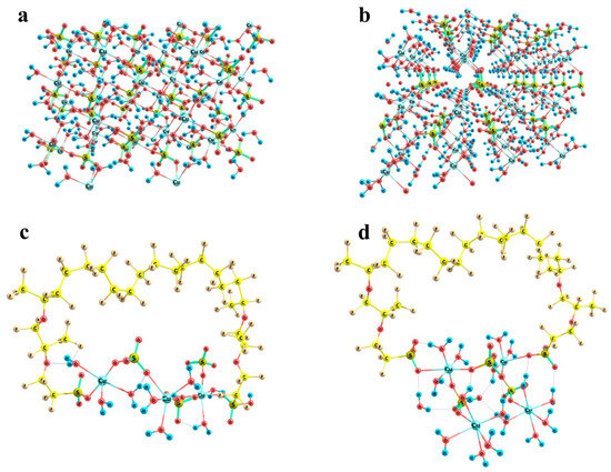 Fragments of the crystal structures of copper sulfate hydrates and the possibility of their building-in between Nafion side chains: Panel (a) CuSO4 × 3H2O lattice segment; Panel (b) CuSO4 × 5H2O lattice segment; Panel (c) (Cu)3(SO4)3(H2O)9 model cluster; Panel (d) (Cu)4(SO4)3(H2O)16 model cluster.
