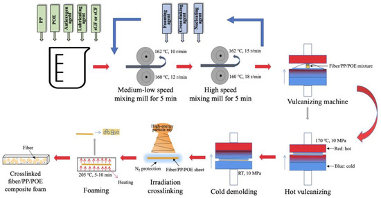 Isotactic polypropylene (PP), a brand of S131, with a molecular weight (Mw) of 420,804 and a melt flow index of 1.3 g/10 min was supplied by Sumitomo Chemical Co., Ltd., Tokyo, Japan. Polyolefin elastomer (POE), a brand of 6202, exhibiting a Shore hardness of 64 A and a melt flow index of 9.1 g/10 min was obtained from ExxonMobil Corporation, Spring, TX, USA. The foaming agent ADC 271, primarily composed of azodicarbonamide, was sourced from Baerlocher GmbH, Unterschleißheim, Germany. Stearic acid was utilized as a lubricant during processing. The antioxidant 1076G was obtained from BASF. The nucleating agent TMA-3, identified as an α-type nucleating agent for improving the cell distribution of foaming materials, was procured from Anhui Xiangyun Rubber Plastic Co., Ltd., Hefei, China. Triallyl isocyanurate (TMPTMA), a brand of TMPTMA-P, was used as a crosslinking agent and was provided by Anhui Xiangyun Chemical Co., Ltd., Hefei, China. Short carbon fibers (sCF), specifically T300 with a length of 2 mm, were procured from Toray. Short glass fibers (sGF) with a length of 3 mm were supplied by Shanghai Lishuo Composite Materials Co., Ltd., Shanghai, China.