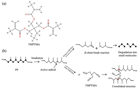 (a) Molecular structure of the crosslinking agent TMPTMA, (b) mechanism of PP chain scission and crosslinking induced by irradiation.