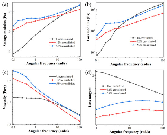 The impact of crosslinking degree on the melt properties of (a) storage modulus, (b) loss modulus, (c) viscosity, and (d) loss factor.
