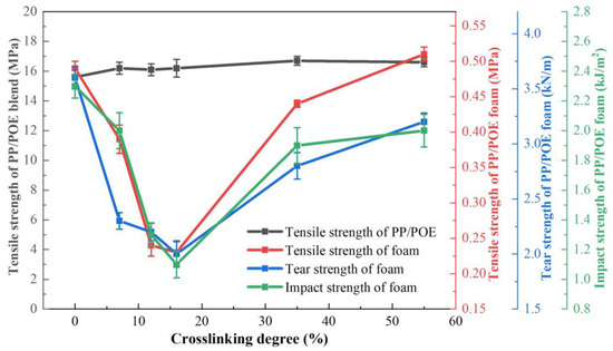The tensile strength, tear strength, and impact strength of the PP/POE blend matrix and foam as a function of crosslinking degree.