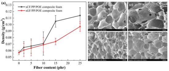 Effects of fiber content on (a) the PP/POE composite foam density, and pore cell morphology of (b,c) 10 phr- and 25 phr-reinforced sCF/PP/POE foam, and (d,e) 10 phr- and 25 phr-reinforced sGF/ PP/POE foam.