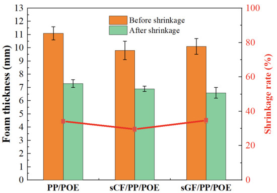 As shown in Figure 9, the addition of sCF is conducive to a slight reduction in the thermal shrinkage of PP/POE material, while sGF has almost no effect. This may be attributed to the negative thermal expansion coefficient of CF, which acts as a counterforce against certain degrees of thermal shrinkage. However, these changes are not significant. A possible reason is that although the addition of fibers is beneficial for increasing the thermal stability of thermoplastic polymers [51,52], in the case of foam structure, the shrinkage behavior is predominantly influenced by the continuous network structure dominated by polymers. Therefore, the contribution of fibers with a dispersed and low faction is limited. In addition, the introduction of fibers deteriorates the overall integrity of the foam and increases the pore size, leading to an increased probability of pore collapse after heating, offsetting the positive contribution of fibers. In the end, the thermal shrinkage stability is not significantly enhanced. However, despite the improvement in material viscosity and thermal shrinkage to some extent with the addition of carbon fibers in sCF/PP/POE, a further comparison with Figure 6 reveals that its contribution is far less significant than the enhanced thermal shrinkage stability brought about by irradiation crosslinking.