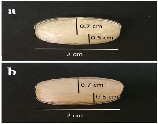 Owing to the fact that the melting point of the ketamine HCl powder (~262 °C) was higher than the maximum melting ability of the 3D printing device (~210 °C), ketamine HCl was dissolved in hydrogel and the hydrogel itself was placed in the shell during the printing process. CMC was selected as the hydrogel polymer because it is soluble in gastric acid. An oval-shape tablet with a length, width, and height of 2, 0.7, and 0.5 cm was designed using Solidwork software (v. 2022) to deliver the desired amount of the drug. The interior compartment of the tablet contained four pits filled with 200 µL hydrogel polymer (20% w/v) containing 162.5 mg ketamine HCl suitable for adult patients. To achieve the best formulation in terms of extrudability, floating, and entire drug release within 12 h, different ratios of Soluplus® to Eudragit® RS-PO polymers were selected (Table 1) for printing the tablet shell. Accordingly, the best formulation was selected for further characterizations.