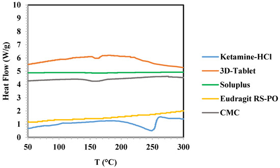 The DSC analysis diagram showing obtained heat flow (W/g) per applied temperature (°C) is illustrated in Figure 5. According to the diagram, no peaks were evident in the DSC thermograms of Soluplus® and Eudragit® RS-PO, signifying the amorphous state of these polymers, while a small peak appeared in the DSC thermogram of CMC at 150–170 °C. Denoting the melting point of ketamine HCl, DSC analysis of ketamine HCl showed an endothermic peak at approximately 250 °C., the DSC thermogram of the 3D-printed tablet displayed a minor endothermic peak at approximately 150 °C. This peak indicates the tablet melting point, encompassing both polymers and the active pharmaceutical ingredient (API). Importantly, this observed melting point matches the one observed during the 3D printing of the shell, which solely consists of polymers.