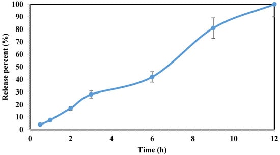 The dissolution test was performed in accordance to the procedure described in Section 2.4 using 12 tablets. Upon contact with the dissolution media, the floating tablet undergoes a process wherein the polymer matrix swells, resulting in the formation of a gel-like structure that envelops the tablet. In this scenario, the release of the drug was accomplished through a dual mechanism: diffusion occurring through the gel-like structure and erosion of the polymer matrix [30].The results demonstrated the complete release of tablet contents within 12 h (Figure 6). At the beginning of the dissolution, the diffusion mechanism is significant compared with the swelling phenomenon, resulting in 28% release at the initial 3 h. However, the impact of polymers swelling (due to their interaction with the dissolution environment) decreased the diffusion influence, and the release reached 42% at 6 h (as indicated by a slope drop in the graph). Nevertheless, over time, as the erosion of the tablet shell increases, the effect of diffusion has once again escalated. At 9 and 12 h, the release has reached 81% and 100%, respectively.