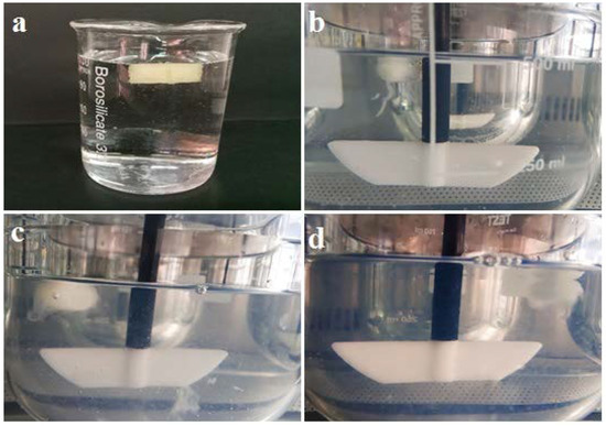 Demonstration of 3D-printed tablet in HCl solution of 0.1 N at 37 °C after (a) 1 h; (b) 3h; (c) 9 h and (d) 12 h.