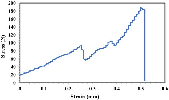 The inclination of the initial linear segment of the stress–strain graph aligns with Young’s modulus (a gauge of material stiffness) [32]. The stress–strain chart for 3D-printed tablets is shown in Figure 8. It demonstrates that the tablets could withstand 190 newtons of stress, reaching their breaking point on strain. The decrease in strain around 90 N force can be attributed to the existence of pits inside the 3D-printed tablet. Therefore, two yield points appeared with 0.25 mm and 0.5 mm strain. However, the tablet stiffness has shown different results in the literature depending on the filament type, composition, and the API percentage [32].