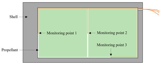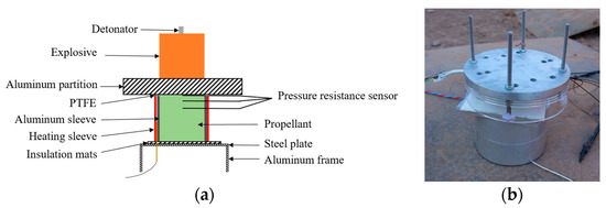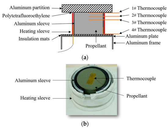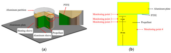 A physical model of the propellant heating simulation is shown in Figure 2a. During the heating, the aluminum sleeve was used to ensure the uniform heating of the propellant. The dimensions of the propellant charge were Φ50 × 40 mm, while those of the aluminum plate were Φ80 × 15 mm; the thickness of the PTFE film was 0.2 mm. Four temperature monitoring points were set inside the propellant, as shown in Figure 2b.