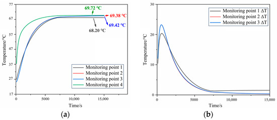 Simulation results of N15 during the thermal equilibrium process. (a) Internal temperature curves and (b) internal temperature difference curves.
