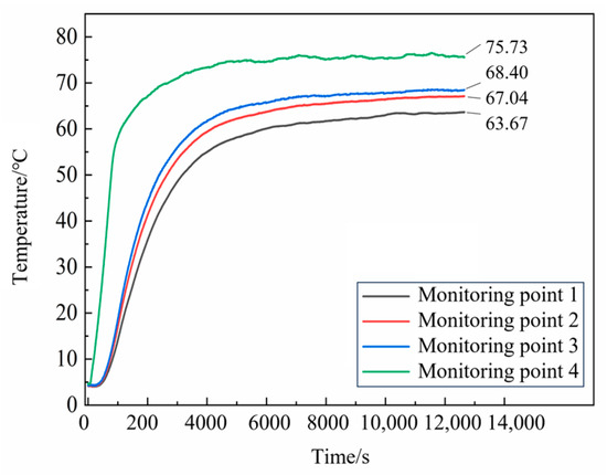 From Figure 4, it can be seen that the temperature on the surface of the propellant increased rapidly during the heating process, while the temperature in the interior increased gradually. After approximately 5000 s of heating, the internal temperature of the propellant stabilized. At 12,000 s, the temperatures measured by thermocouples 1, 2, 3, and 4 were 63.42, 66.97, 68.36, and 75.88 °C, respectively. The temperature differences from 70 °C at each measurement location were 9.4%, 4.3%, 2.3%, and 8.4%, respectively, all of which were less than 10%.