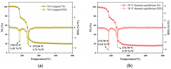 TG and DTG curves of the propellant at different temperatures. (a) TG and DTG curves of the propellant at 20 °C and (b) TG and DTG curves of the propellant at 70 °C.