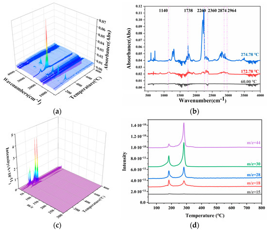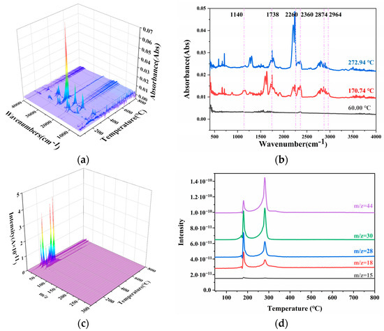 The FTIR and MS curves of N15 at 70 °C. (a) The FTIR curves of N15, (b) the absorbance distribution curves of N15, (c) the MS curves of N15, and (d) the intensity curves of N15.