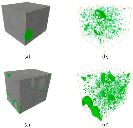Micro-CT of N15 at different temperatures. (a) The 3D view of N15 at 20 °C, (b) the pore distribution of N15 at 20 °C, (c) the 3D view of N15 at 70 °C, and (d) the pore distribution of N15 at 70 °C.