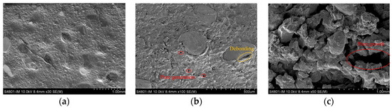 According to Equation (2), is inversely proportional to the particle radius . Therefore, larger particles are more prone to de-bonding compared to smaller particles and this is consistent with the SEM observations, presented in Figure 12.