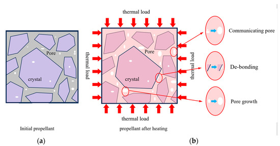 Schematic of damage mechanism. (a) Initial propellant and (b) propellant after heating.