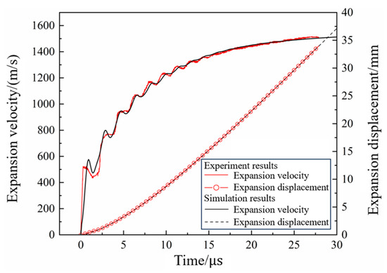In the cylinder test, the calculated results of the wall expansion velocity and displacement curves were compared with the experimental results, as shown in Figure 17. It can be seen that the calculated and experimental results were in good agreement. After segmenting the linear interpolation of the velocity curve, the error between the simulated and the experimental results was calculated using the least squares method; this yielded an error of 3.67%, which indicates that the calibrated JWL equation parameters could effectively describe the process of metal acceleration driven by the detonation of N15. The Gurney velocity of the N15 high-energy propellant is calculated as 2469 m/s. The calibrated JWL equation parameters of N15 are presented in Table 3.