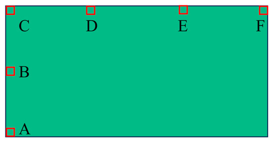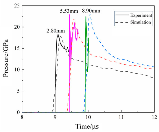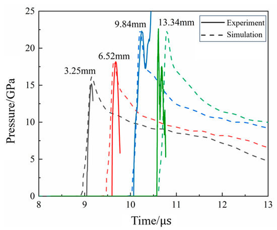 Six locations, as shown in Figure 31, are selected to observe the reaction process of the propellant. The pressure curves at different locations of the N15 high-energy propellant when the thickness of the end cover is 5 mm are shown in Figure 32. The chemical reaction first occurred at positions A and B, due to the impact of the EFP. But the intensity of the external stimulus is not strong enough to make the reaction complete. Locations C, D, E, and F developed a stabilized detonation under the combined effects of the EFP impact and the shock waves generated by chemical reactions at other positions. At t = 201 μs, location A was subjected to the pressure of 8.5 GPa, which was generated by the impact of the EFP on the shell. At t = 208 μs, location A was subjected to the effect of the shockwave, which was generated by the chemical reaction in location C, which leads to the secondary pressure rise. Locations C, D, E, and F are the four observation points on the outside of the high-energy propellant pillars, and with the axial propagation of the spherical pressure wave inside the propellant, the chemical reaction begins to take place at these locations. At t = 214 μs, the pressure wave reaches the bottom of the propellant and the pressure peak at location F was 17.4 GPa.