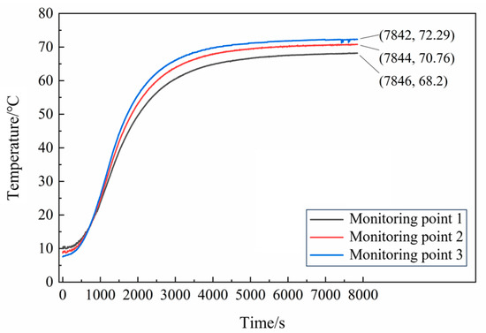A heating test was conducted on N15 at 70 °C. To ensure that the propellant reached the desired temperature, the constant heating temperature was raised by 10 °C. The temperature–time curves from the test at different locations within the propellant are shown in Figure 4.