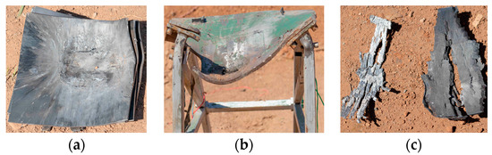 Experimental results after the EFP impact test at 70 °C. (a) Witness Plate, (b) steel support, and (c) shell fragments.