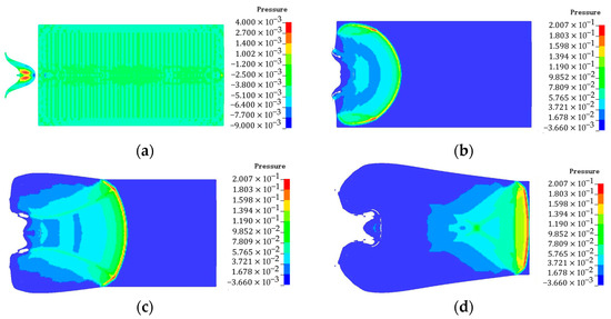 Pressure contours of N15 at 20 °C (end cover thickness: 5 mm, Unit is 100 GPa). (a) t = 198 μs, (b) t = 205 μs, (c) t = 208 μs, and (d) t = 214 μs.