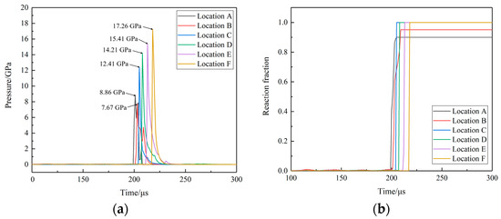 The histories of pressure and reaction fraction at different locations. (a) The pressure curves at different locations and (b) the reaction fraction curves at different locations.