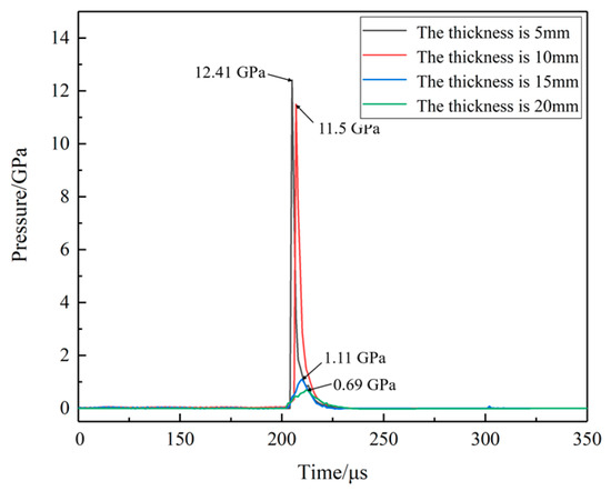 The pressure curves at location A and C for different shell thicknesses are shown in Figure 33 and Figure 34. When the thickness is 10 mm, the shock wave pressure generated at location C is larger than the pressure wave which is generated by the impact of the EFP, location C does not show a secondary pressure rise. With the increase in the shell thickness, the pressure on the propellant during the impact of EFP decreases dramatically. The peak pressure at location A is reduced from 8.5 GPa to 1.4 GPa at location A. The peak pressure at location C is reduced from 12.4 GPa to 0.8 GPa. When the thickness of the shell is 15 mm, the surface of the propellant is compressed under the initial impact, and the phenomenon of temperature increase is observed. The accumulation of heat generates a hot spot in location A. However, due to the expansion of the propellant, the protection of the shell absorbed part of the energy of the shock wave so that the hot spot stopped generating heat, the temperature of the propellant did not reach the reaction temperature, and the reaction not happen.