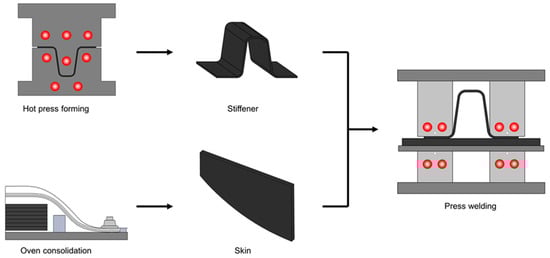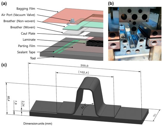 The manufacturing process of the skin and stiffener applied in the experiment and a drawing of the welded product are shown in Figure 5. The skin was consolidated using a vacuum bag oven process (Figure 5a), laminating a total of 56 plies in a quasi-isotropic layup sequence of [+45/0/−45/90]7s. The lamination process began by placing a parting film atop the tool, followed by the prepreg. Subsequently, a cowl plate, breather, and bagging film were layered in sequence, and a vacuum of 1 bar was applied. The entire parts were then oven-heated. The consolidation phase involved holding the sample at 380 °C for 1 h, followed by cooling to room temperature before ejection. Figure 5b shows the stamp forming tool for the stiffener’s forming tool applied in the experiment.