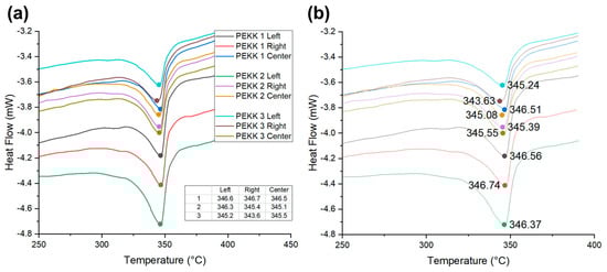 Figure 3 presents the results from differential scanning calorimetry (DSC) analysis aimed at identifying the optimal temperature range for the welding process. This analysis focused on the determination of the melting point of the PEKK laminate and the Tg of the PEI adhesive film. The experiments were performed using a TA-100 SDT Q600 instrument under nitrogen atmosphere conditions, with cooling facilitated air exposure at 24 °C, omitting the need for a separate cooling apparatus. Figure 3a reveals that the average melting point of the PEKK laminate was marginally above the manufacturer’s specified value with values equal to approximately 345 °C in the nine tested samples. This discrepancy is attributed to the thermal history effects arising from the secondary heating for lamination consolidation. To enhance crystallinity while consolidating the laminate, a cooling rate of 17 °C/min was applied, which is relatively low. The prepreg indicated relatively low results in comparison to the melting point of the laminate, caused by thermal history. Therefore, it is assumed that the melting point of materials that have undergone the laminate consolidation process has increased due to the dissociation of spherulite crystalline.