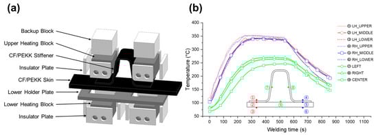 Figure 6 shows a drawing of the press conduction welding tool and data for evaluating the heating performance of the tool. Figure 6a presents a three-dimensional (3D) representation of the welding jig. To ensure temperature uniformity, a ceramic insulator was affixed to all sides except the contact area between the specimen and the heating block, and thus concentrated the heat within the overlapping flange region between the skin and omega stiffener. The alignment of the top and bottom heating blocks was achieved by using the base plate, while the demonstrator was accurately positioned for welding using a pilot pin on the lower holding plate. Cartridge heaters were employed to heat the block, with a PID method regulating the temperature to attain a target temperature of 340 °C at the interface between the skin and omega stiffener. Figure 6b depicts the thermal profile of the specimen mounted on the press conduction welding jig. To perform welding, the sample was positioned in a conduction welding device at a relatively low temperature. The sample was heated at the same time as the tool; therefore, the heating time varied based on the tool’s temperature due to the sample’s heating. To ensure steady heating, a technique was adopted to heat simultaneously the sample and the tool. Verification of unnecessary variables was performed based on temperature measurements to prevent the deformation of the specimen or joint area. The maximum temperature in areas not designated for welding reached 247 °C, and the omega stiffener’s left and right walls experienced marginally higher temperatures than the center of the skin. Consequently, to ensure consistent process conditions, the skin/omega stiffener specimen was maintained at an interface temperature of 340 °C and at a pressure of 1 MPa for a welding duration of 3 min. Three specimens were fabricated and tested.