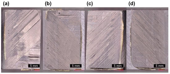 The Tg of the PEI adhesive film was approximately 216 °C, which aligns with the manufacturer’s specifications. The minimum temperature required for the process was determined to ensure the PEI adhesive film melts sufficiently. The DSC experiment results showed that PEI has a Tg of 216 °C with a clear inflection point. However, determining sufficient fluidity based on Tg is difficult, so a higher temperature of 260 °C was set as the lower limit of the process temperature, as shown in Figure 3b, where stable heating occurs after the endothermic reaction. Consequently, a processing temperature range was defined (from 260 °C (at which the PEI adhesive film attains adequate fluidity above its Tg) to 340 °C (which approaches the melting temperature (Tm) of the PEKK matrix)). The rationale behind this range was to avoid temperatures exceeding the Tm of PEKK, because the matrix phase becomes considerably fluid above the Tm of PEKK, challenging the maintenance of shape and leading to potential fiber spreading. To explore the effect of temperature on the process, welding tests were conducted at 20 °C intervals within this range. The welding process parameters for the single-lap shear test are listed in Table 1.