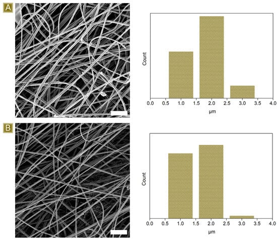 Morphological characterisation of the spun fibres (A) before and (B) after thermal curing. Scale bars: 20 µm.