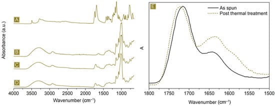 FTIR-ATR of (A) CIT, (B) GLU2, (C) as-spun mat, and (D) spun mat after thermal treatment. (E) Details of the carbonyl signal, range: 1800–1500 cm−1.
