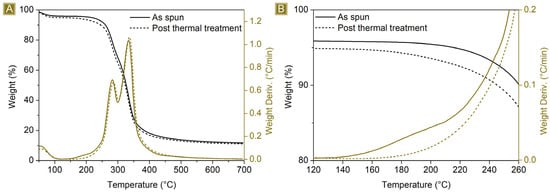 (A) TGA (black) and related DTGA (brown) of as-spun mat (solid) and (dot) spun mat post thermal treatment. (B) Details of the temperature interval.