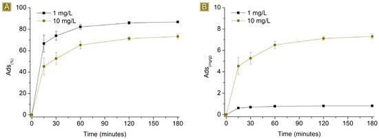 Time-dependent sorption of AT was observed in Figure 5, which rapidly increased over the first hour, reaching a plateau beyond 120 min of contact time between the mat and the AT solution. The highest Sor(%), from 1 mg/L AT solutions, resulted in 86.8 ± 0.2%, with Sor(mg/g) corresponding to 0.83 ± 0.01 mg/g. In the case of 10 mg/L AT solutions, the highest Sor(%) was 73.2 ± 2.3%, with Sor(mg/g) corresponding to 7.31 ± 0.23 mg/g. The ability of the mat to remove AT from water may be related to the presence of residual free carboxylic functions belonging to CIT on the spun fibres, as reported in Figure 1 and confirmed via FTIR-ATR, which can generate electrostatic interactions with AT molecules. Additionally, the kinetic profile can be related to the hydrophilic nature of the spun material. When the mats come in contact with aqueous media, the solution penetrates the inner parts of the fibres, where electrostatic interactions can form as a function of the diffusion of the solution during that time. As a consequence, the removal of AT via electrostatic interaction is a phenomenon not limited to the surface of the sorbent.