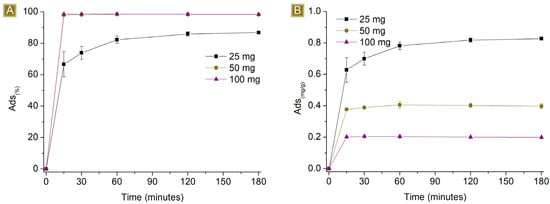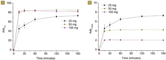 Sorption profiles (A) Sor(%) and (B) Sor(mg/g) of increasing amounts of fibres in 25 mL of 10 mg/L AT solution vs. time.