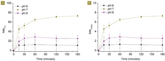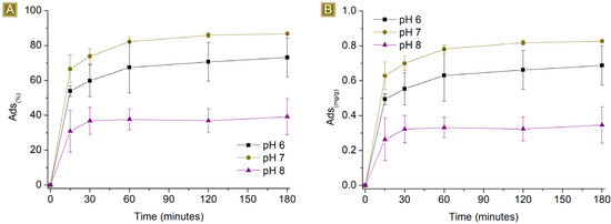 Sorption profiles (A) Sor(%) and (B) Sor(mg/g) of 25 mg of sorbent in 25 mL 10 mg/L AT solution by changing the pH of the solution vs. time.