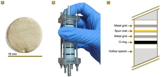 (A) Circular specimens obtained from the cured spun mat, (B) multistep column used for the fixed bed sorption test, and (C) scheme reporting the section of the column.