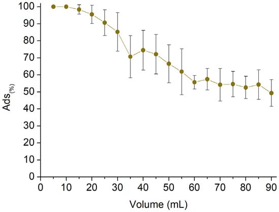 The last part of the work was carried out to evaluate the potential applicability of the reported fibrous mats in continuous sorption scenarios. Circular samples with a diameter of 16 mm (Figure 11A) were obtained from the thermally treated spun mat and subsequently placed in a multistep column (Figure 11B). The column is composed of six steps, each consisting of one disc of mat confined between two metal grids and an O-ring to ensure flow passage through the membrane (Figure 11C). Each step is separated from the others with a hollow spacer, and the total amount of membrane is 45 mg. The test was carried out using a 2.5 mg/L AT solution. The AT concentration was monitored as the latter permeated through the mats at a flow rate of 0.5 mL/min, with measurements taken every 5 mL of solution withdrawn. Figure 12 shows the Sor(%) reported in response to the permeated volume. The results indicate that the sorption percentage was higher than 90% during the first 25 mL of withdrawn solution and remained over 60% up to 55 mL of recovered solution. However, the sorbent removal capacity subsequently decreased to approximately 50% between 60 and 90 mL of permeate solution. The test was stopped at this point. Taking into account the volume, the amount of sorbent, and the concentration of AT, a Sor(mg/g) equal to 6.30 mg/g was obtained. This value shows good agreement with the highest Sor(mg/g) value observed from the batch tests, which was equal to 7.31 mg/g.